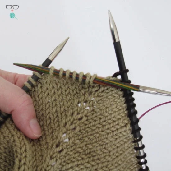 If you're already using your only size 8 interchangeable needle, no sweat - go down a needle size for this exercise. Also - this was really hard to photograph for some reason. This is the Knit Picks Harmony I think... it purple wooden needle in any case.