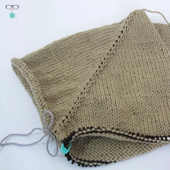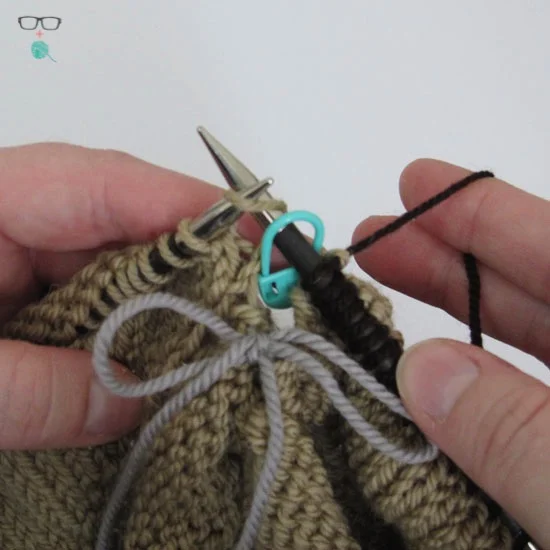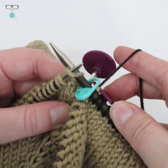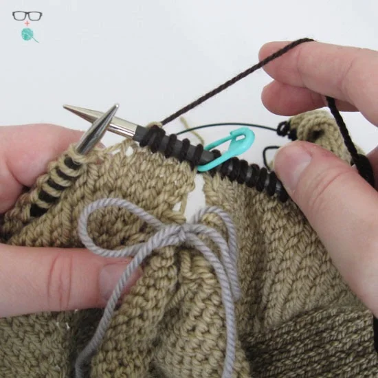 But before we get to dividing the sleeves out, we're going to use our "Stripe" color to get to the first marker. So, cut the main color yarn, leaving a tail for weaving in, and grab your new color (mine is Chocolate.... yummy!). If you've decided to use multiple colors for the stripes, as I know at least one of you has, make sure you've planned out what order your stripes will go in. You'll want to use the color for your first stripe here.