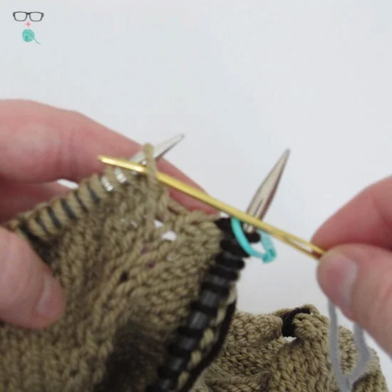 Much like our previous method, we're going to use the tapestry needle like a standard knitting needle - we're going to feed the tapestry needle through the live sleeve stitches, PURLWISE, and collect all of the live stitches on the waste yarn.