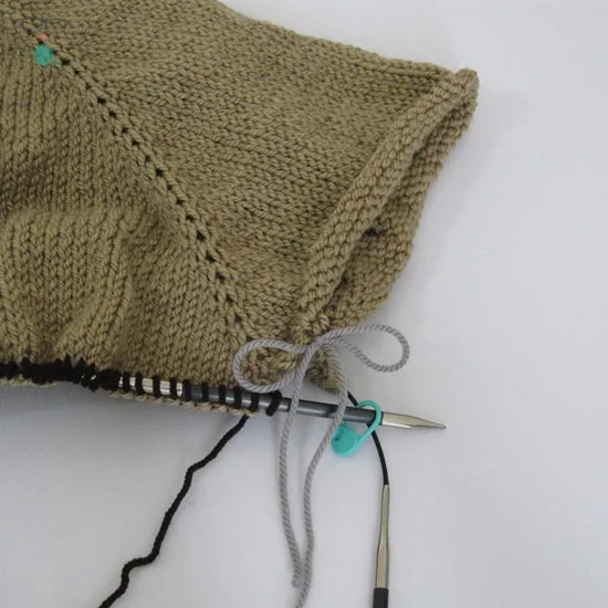 Here are the first 7 sts of the sleeve on the temporary needle.