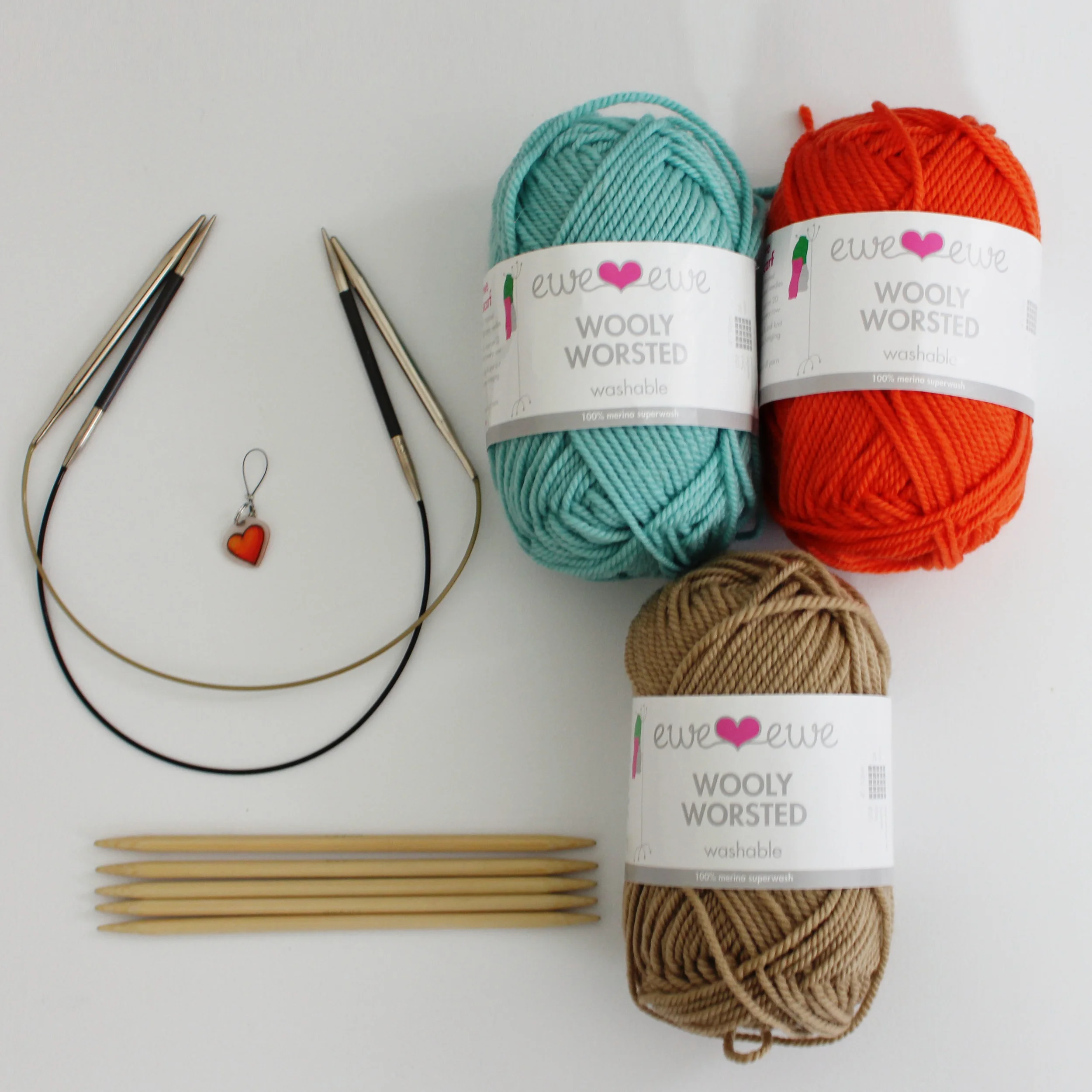 - Ewe Ewe Yarns Wooly Worsted (100% superwash merino, 95 yds/50g) in 3 colors: one main color, one neutral color and one bright color. Note that you'll only need ONE skein of each color to complete this MKAL.